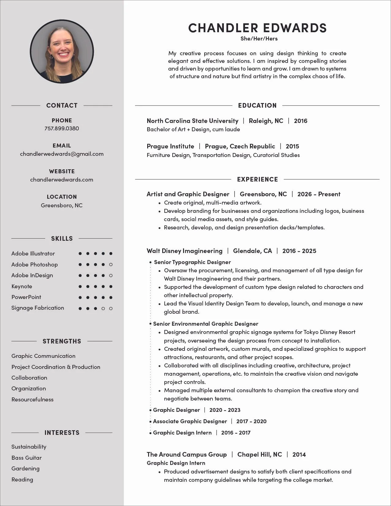 My creative process focuses on using design thinking to create elegant and effective solutions. I am inspired by creative stories and driven by opportunities to learn and grow. I am drawn to systems of structure and nature but find artistry in the complex chaos of life.